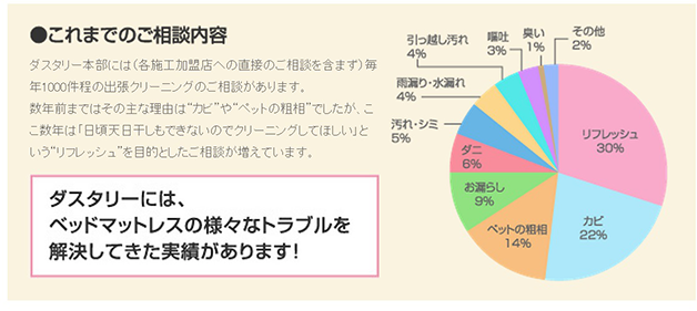 布団は天日干しできても、ベッドマットレスの天日干しは簡単ではありません。 布団やシーツはすぐに洗濯やクリーニングができますが、 ご自宅でベッドマットレスの洗濯やクリーニングはご自身ではできません。 そこで私共ダスタリーは、皆様のご自宅まで出張の上、 洗浄・殺菌・消毒・乾燥まで行うベッドマットレスクリーニングサービスを展開し、 お客様より大変喜んで頂いております。